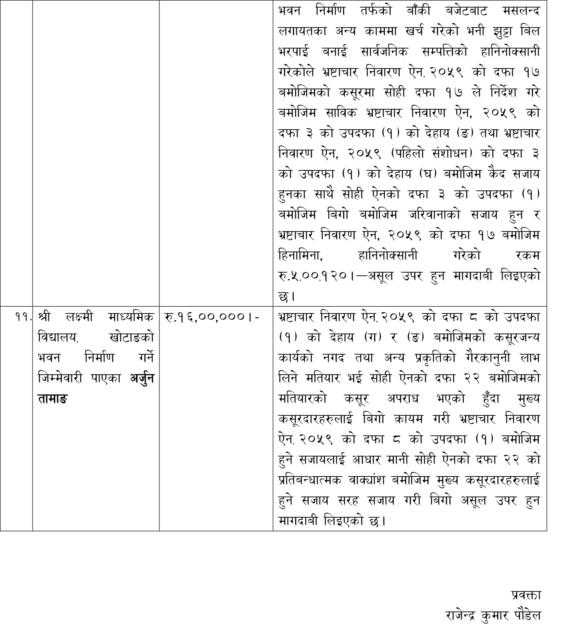 हलेसी तुवाचुङ नगरपालिका—४ स्थित श्री लक्ष्मी माध्यमिक विद्यालय, बडहरेको विद्यालय भवन निर्माण गर्दा तत्कालीन विद्यालय व्यवस्थापन समितिका अध्यक्षको मिलेमतोमा डीपीसी मात्र तयार गरी रकम हिनामिना गरेको आरोपमा उनीहरूविरूद्ध मुद्दा दायर भएको अख्तियारले जनाएको छ ।