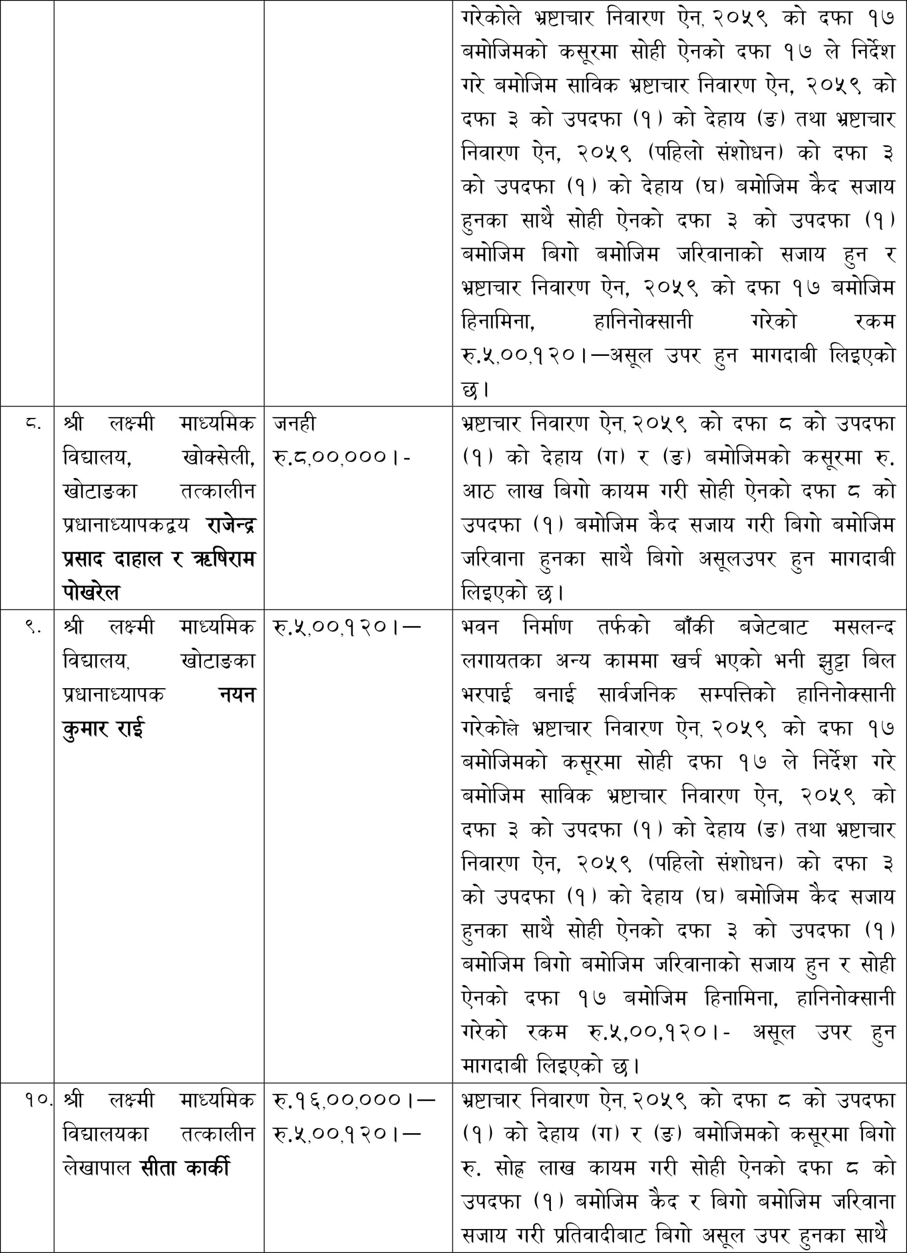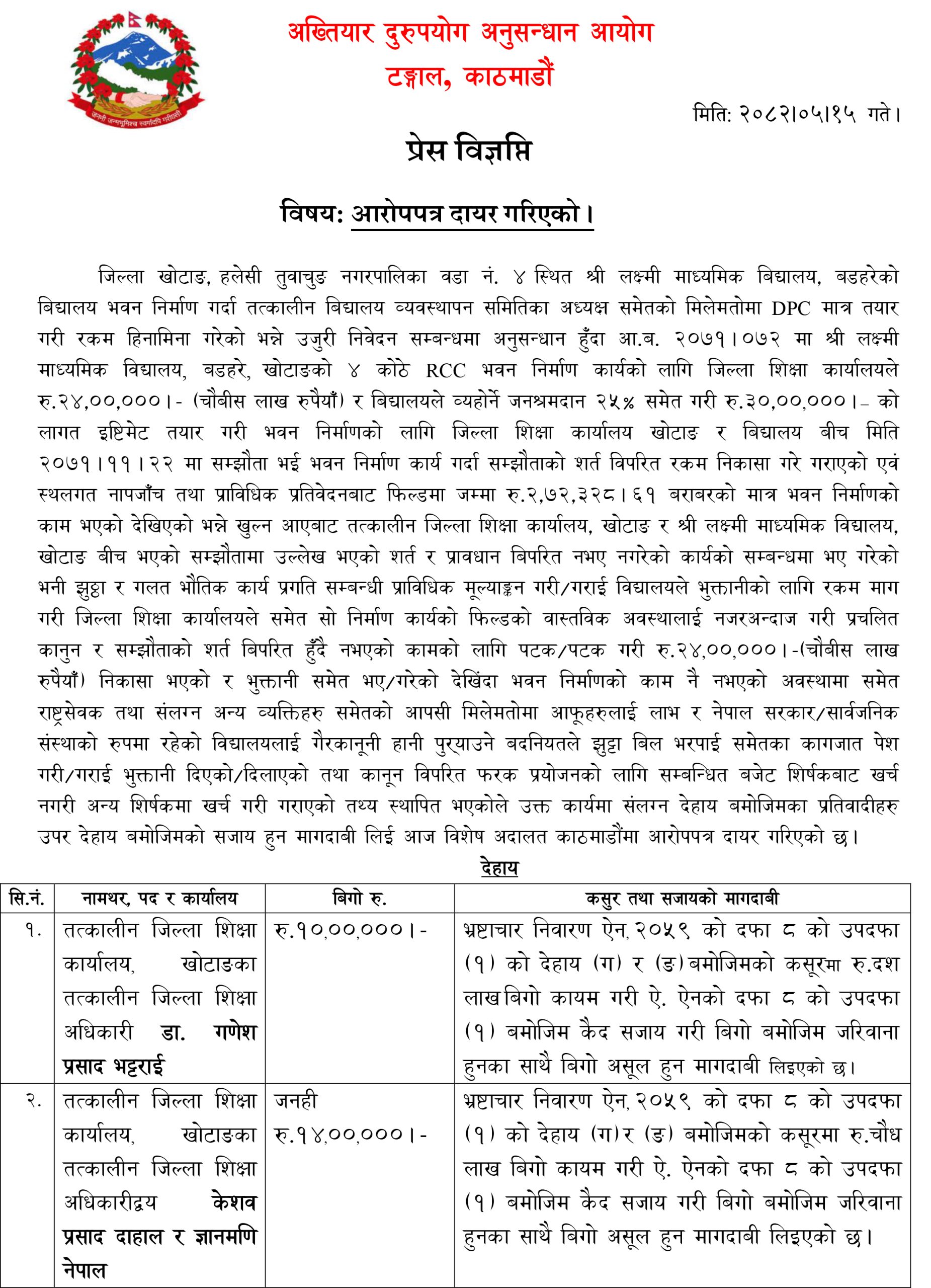 हलेसी तुवाचुङ नगरपालिका—४ स्थित श्री लक्ष्मी माध्यमिक विद्यालय, बडहरेको विद्यालय भवन निर्माण गर्दा तत्कालीन विद्यालय व्यवस्थापन समितिका अध्यक्षको मिलेमतोमा डीपीसी मात्र तयार गरी रकम हिनामिना गरेको आरोपमा उनीहरूविरूद्ध मुद्दा दायर भएको अख्तियारले जनाएको छ ।