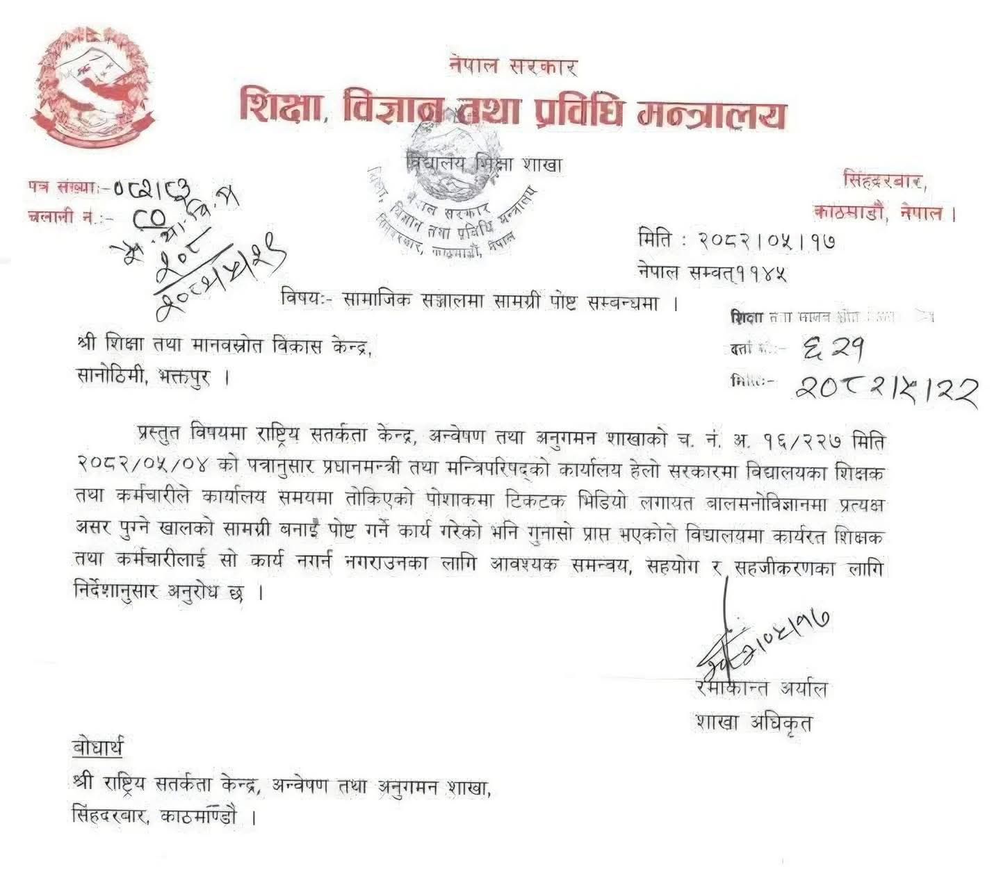 शिक्षकलाई कार्यालय समयमा टिकटक भिडियो नबनाउन शिक्षा मन्त्रालयको निर्देशन
